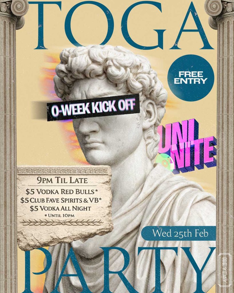 Channel your inner god or goddess and party like itโs ancient Greece at Uni Niteโs Toga Party on Wednesday, 25th Feb ๐โก๏ธ